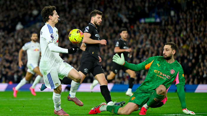 第38分钟,利兹联的防守反击险些转化为进球,阿隆森的单刀机会变成强弩之末,多纳鲁马将球挡出。